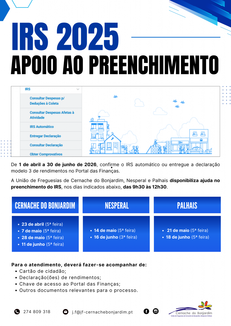 A União de Freguesias disponibiliza apoio gratuito ao preenchimento do IRS, em dias específicos nas três freguesias, das 9h30 às 12h30.
